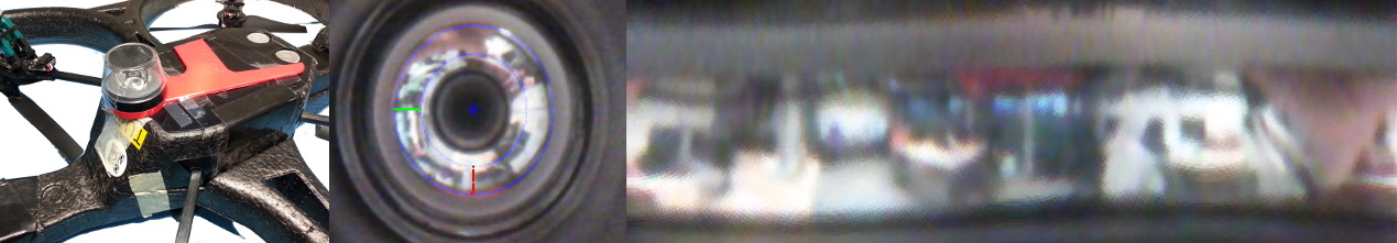 @image html images/airborne/modules/pano_unwrap/pano_unwrap.jpg "Left: AR.Drone 2.0 with Kogeto Dot 360 panoramic lens on bottom camera. Middle: raw image and region of interest (blue). Right: unwrapped image."