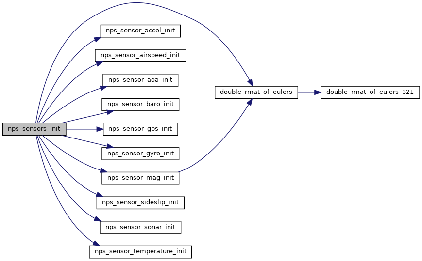 References NpsSensors::accel, NpsSensors::airspeed, NpsSensors::aoa, NpsSensors::baro, NpsSensors::body_to_imu_rmat, double_rmat_of_eulers(), NpsSensors::gps, NpsSensors::gyro, NpsSensors::mag, nps_sensor_accel_init(), nps_sensor_airspeed_init(), nps_sensor_aoa_init(), nps_sensor_baro_init(), nps_sensor_gps_init(), nps_sensor_gyro_init(), nps_sensor_mag_init(), nps_sensor_sideslip_init(), nps_sensor_sonar_init(), nps_sensor_temperature_init(), sensors, NpsSensors::sideslip, NpsSensors::sonar, and NpsSensors::temp.
