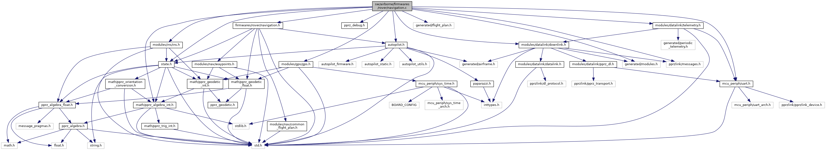#include "firmwares/rover/navigation.h"#include "pprz_debug.h"#include "modules/gps/gps.h"#include "modules/ins/ins.h"#include "state.h"#include "autopilot.h"#include "generated/modules.h"#include "generated/flight_plan.h"#include "math/pprz_algebra_int.h"#include "modules/datalink/downlink.h"#include "pprzlink/messages.h"#include "mcu_periph/uart.h"#include "modules/datalink/telemetry.h"