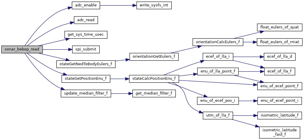 References adc_buffer, adc_enable(), adc_read(), AGL_SONAR_ADC_ID, DefaultChannel, DefaultDevice, SonarBebop::distance, get_sys_time_usec(), SonarBebop::meas, mode, spi_transaction::output_buf, FloatEulers::phi, pulse_transition_counter, sonar_bebop, SONAR_BEBOP_ADC_BUFFER_SIZE, SONAR_BEBOP_ADC_MAX_VALUE, SONAR_BEBOP_INX_DIFF_TO_DIST, SONAR_BEBOP_MAX_TRANS_TIME, SONAR_BEBOP_MIN_PEAK_VAL, SONAR_BEBOP_PEAK_THRESHOLD, sonar_bebop_spi_d, sonar_bebop_spi_t, SONAR_BEBOP_TRANSITION_COUNT, SONAR_BEBOP_TRANSITION_HIGH_TO_LOW, SONAR_BEBOP_TRANSITION_LOW_TO_HIGH, sonar_filt, spi0, spi_submit(), SPITransDone, SPITransSuccess, stateGetNedToBodyEulers_f(), stateGetPositionEnu_f(), spi_transaction::status, FloatEulers::theta, update_median_filter_f(), and EnuCoor_f::z.