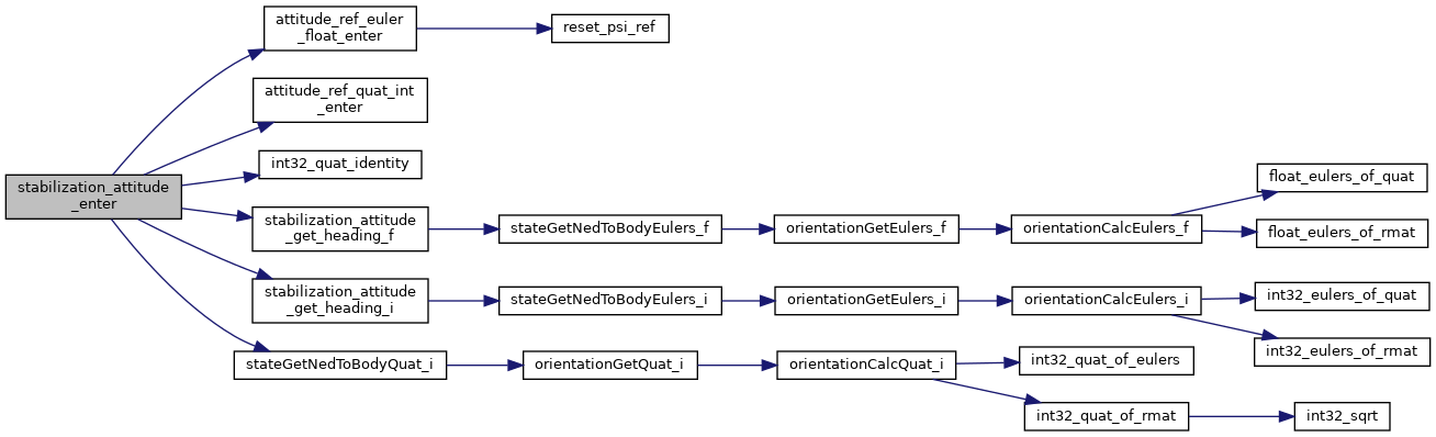 References att_ref_euler_f, att_ref_quat_i, attitude_ref_euler_float_enter(), attitude_ref_quat_int_enter(), FLOAT_EULERS_ZERO, int32_quat_identity(), FloatEulers::psi, Int32Eulers::psi, stab_att_sp_euler, stabilization_att_sum_err, stabilization_att_sum_err_quat, stabilization_attitude_get_heading_f(), stabilization_attitude_get_heading_i(), and stateGetNedToBodyQuat_i().
